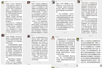 习近平总书记在大会上深刻总结了党过去五年的工作和新时代十年的伟大变革,五年来,我们党团结带领人民,攻克了许多长期没有解决的难题,办成了许多长期没有解决的大事要事,推动党和国家事业取得了举世瞩目的重大成就。十年来,党和国家事业取得历史性成就、发生历史性变革,推动我国迈上全面建设社会主义现代化国家新征程。同学们牢记习近平总书记的讲话,认真思考,在直播结束后心潮澎湃,纷纷在线上发表心得感悟,并自发将二十大报告推文分享至朋友圈。