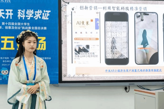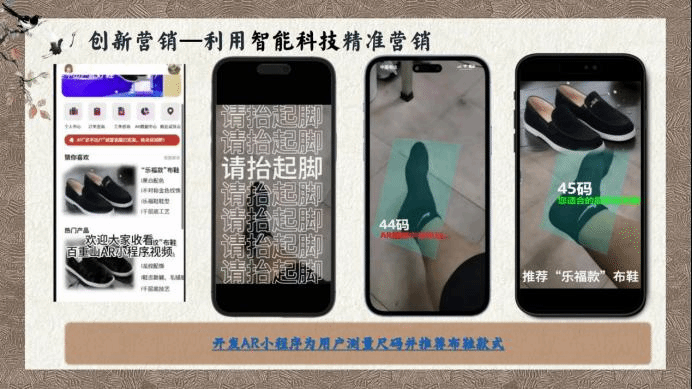 事实表明,张毅老师的担心并非多余。团队在深入了解电商营销布鞋的同类竞争者之后,发现市场上早已具备成熟的电商营销布鞋品牌,例如老北京布鞋已成为该领域的佼佼者,项目相较之下没有明显竞争优势。在校赛答辩环节,评委老师也尖锐的指出,项目缺乏科技创新环节,难以吸引精准用户。为了解决该困境,团队成员纷纷跳出原有领域,努力补学其他领域的专业知识,视觉传达、人工智能……只要有助于项目推进,哪怕是从未接触过的知识领域,队员们也都没有丝毫退却。最终在相关专业同学的帮助下,创新设计出”百重山智慧商城”、“AR试鞋小程序”等吸引国潮爱好者的软件,利用智能科技实现了精准营销。