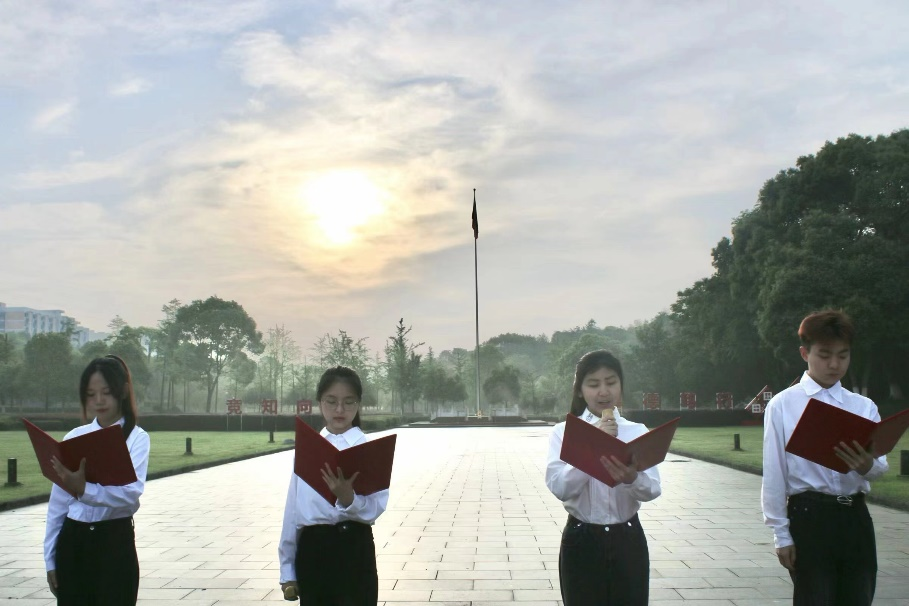 万里功名在实干,百舸争流看今朝。学习部主持队李祺、许佳雪、李扬、周建芳4名学生代表为师生带来《红色赞歌》朗诵,他们以声传情,歌颂党的百年光辉历程和伟大成就,让全体同学从红色诗歌中更好地感悟信仰之力,充分引导同学们珍惜当下来之不惜的和平生活,捍卫国家安全。
