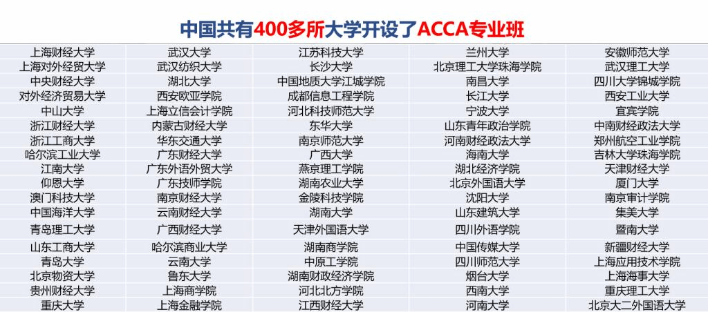 ACCA 全国合作高校超过 300+所,包括对外经济与贸易大学、哈尔滨工业大学、南开大学、上海财经大学、江西财经大学等院校均开设了 ACCA 专业方向班或把ACCA 证书课程纳入自身培养体系。