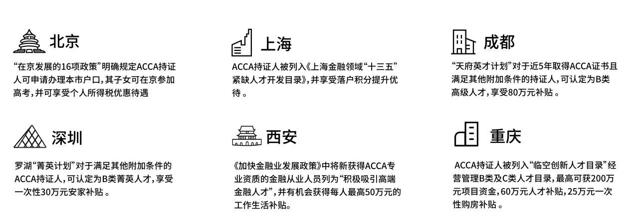 ACCA 会员资格在国内广泛被认可,多地政府都将 ACCA 持证人员列入稀缺性 高端财会人才,包括北京、上海、广州、深圳、成都、西安、重庆、天津、厦门、南昌等在内的各大城市相继出台各项优待政策,ACCA 持证人可享受诸如积分落户、 个税减免、专项奖金、置业补贴、子女入学等各项优待。部分城市 ACCA 人才优待政策如下: