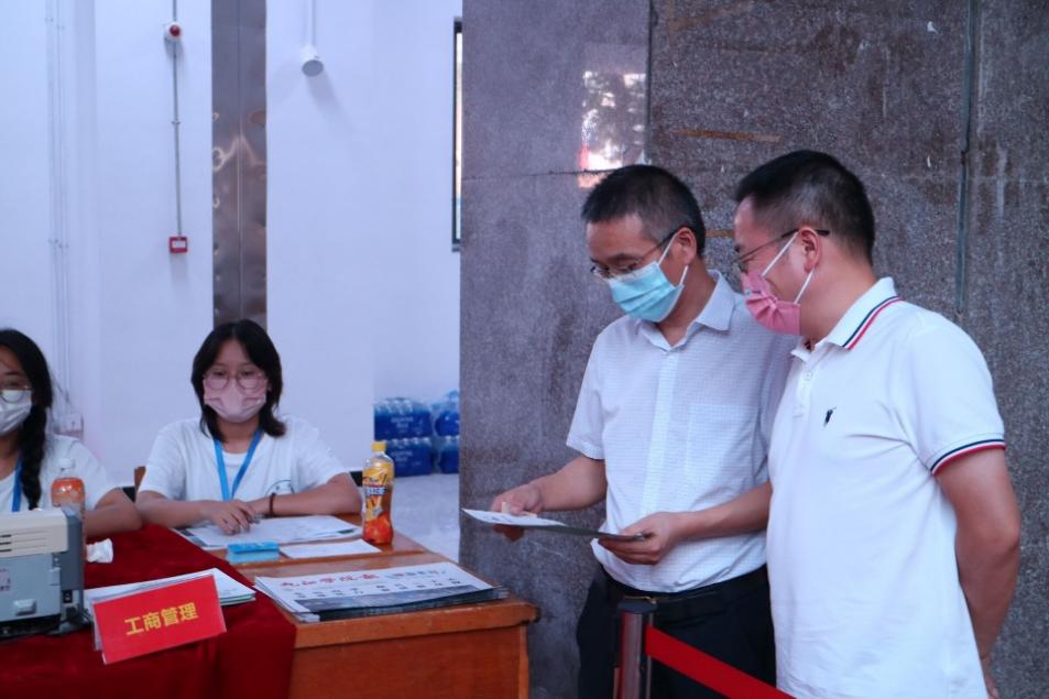 迎新期间,金年会jinnianhuicom院长许松涛、党委书记赵宇剑多次来到北区田径馆慰问在场的老师与迎新工作人员,亲切询问迎新工作中遇到的困难,给出细致指导,叮嘱工作人员在工作中戴好口罩注意防护保证个人人身安全,学院党委副书记周梓哲、学生科、思政科负责人全程在迎新现场指导工作,与迎新工作者们“战”在一起,迎新工作有序、高效进行。