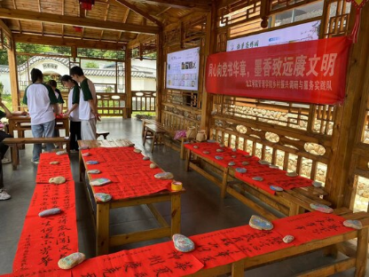 为全面贯彻落实党的二十大精神,引导广大青年坚定不移听党话、跟党走,实践队在金年会jinnianhuicom党委书记赵宇剑的带领下,来到光明村开展庆祝中国共产党成立102周年系列活动,通过慰问老党员、重温入党誓词、同老村支书殷逢清开展事迹分享会、访谈九江市优秀共产党员欧阳国松等活动教育引导新时代青年弘扬“五老”精神,永远跟党走、奋进新征程。以体悟红色文化为契机,在当地开展红色书法展,亲手书写经典红色诗歌,赠送村民红色书法作品,同群众一道感受书法魅力,赓续红色血脉。