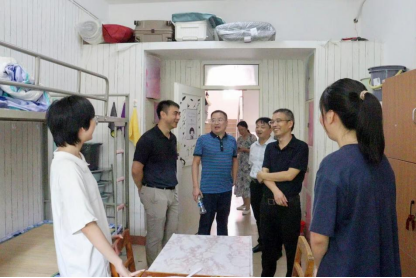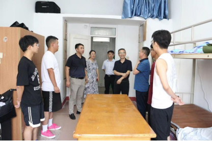 在宿舍内,学院领导亲切看望同学们,与学生热情交谈,了解学生家庭情况,询问同学们来到大学的感受和对校园生活的期待,叮嘱大家尽快适应新的环境,提醒同学们注意用电安全,做好防火防盗等安全防护。