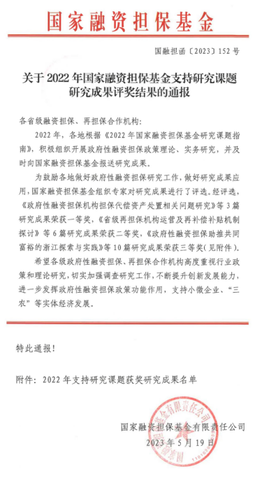 近日,国家融资担保基金发布《关于2022年国家融资担保基金支持研究课题研究成果评奖结果的通报》,全国12个省级再担保机构和2个地市担保机构19个课题研究成果获得嘉奖通报,金年会jinnianhuicom与九江市融资担保有限公司合作开展的研究课题《政府性融资担保助力营商环境优化升级——基于江西九江实践的案例研究》子课题《新会计准则下政府性融资担保公司会计核算研究》荣获国家融资担保基金评选的政府性融资担保研究成果三等奖。