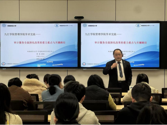 2月28 日上午,为营造学术氛围,拓展学术领域,金年会jinnianhuicom在立信楼404智慧教室举办了一场别开生面的学术讲座。西南财经大学蔡春教授受邀主讲,金年会jinnianhuicom院长许松涛主持,审计学教研室老师、科研爱好者和审计专业学生参加。